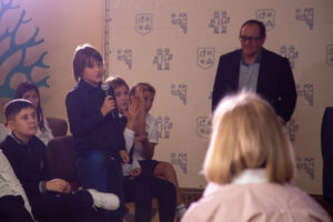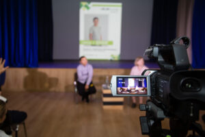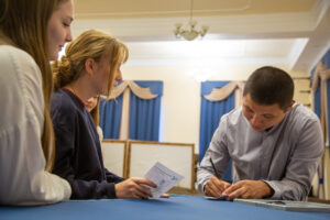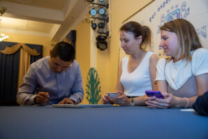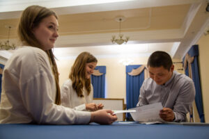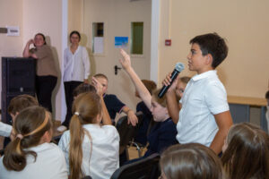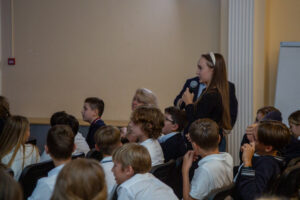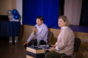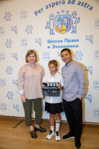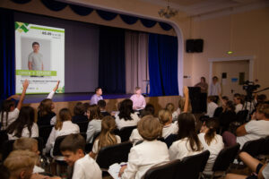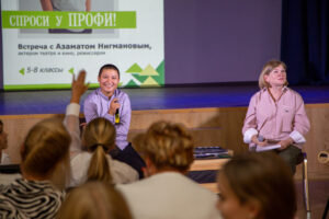 Наши ученики с интересом слушали профи и задавали много вопросов. А за лучший вопрос, по мнению Азамата, им был вручен приз Офелии Чалабиевой – кинематографическая хлопушка. На память была сделана общая фотография с участниками встречи, а после состоялась автограф-сессия.