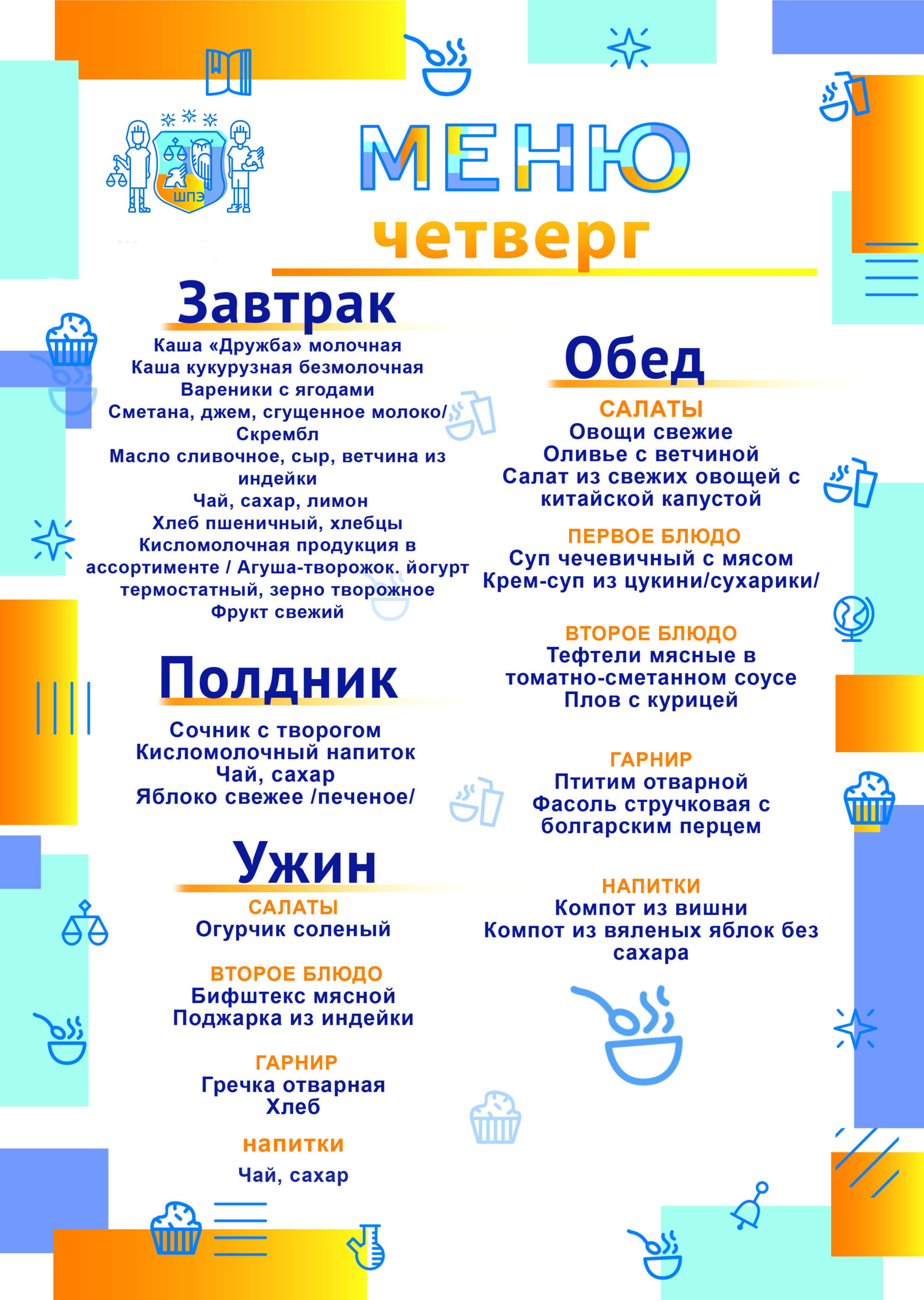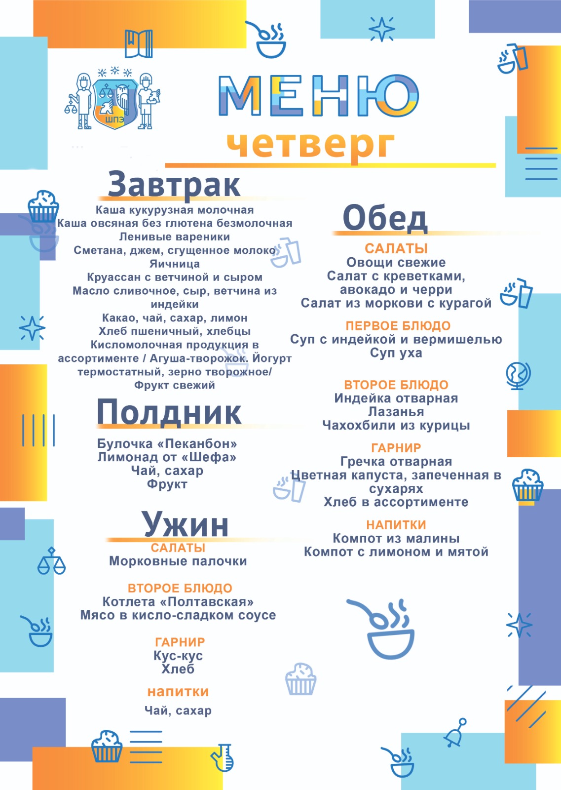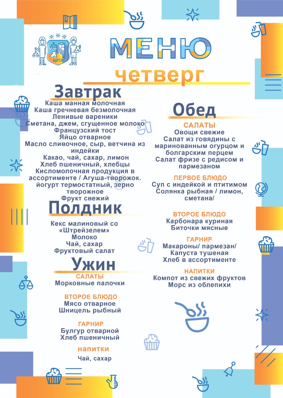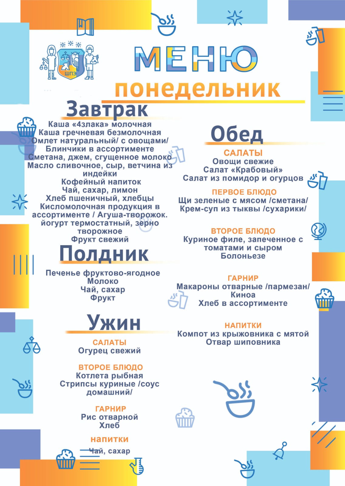 Обучающиеся школы получают полноценные, по-домашнему вкусные завтраки, обеды полдники и ужины, приготовленные в школьной столовой. Меню школьной столовой разработано с учетом индивидуальных особенностей учеников школы и отвечает запросам самых требовательных ценителей изысканной пищи. Поставка продуктов осуществляется российскими производителями сельскохозяйственной продукции, не содержащих ГМО.