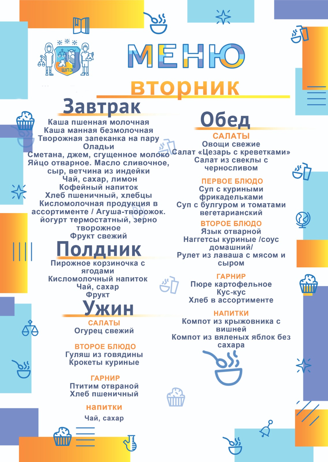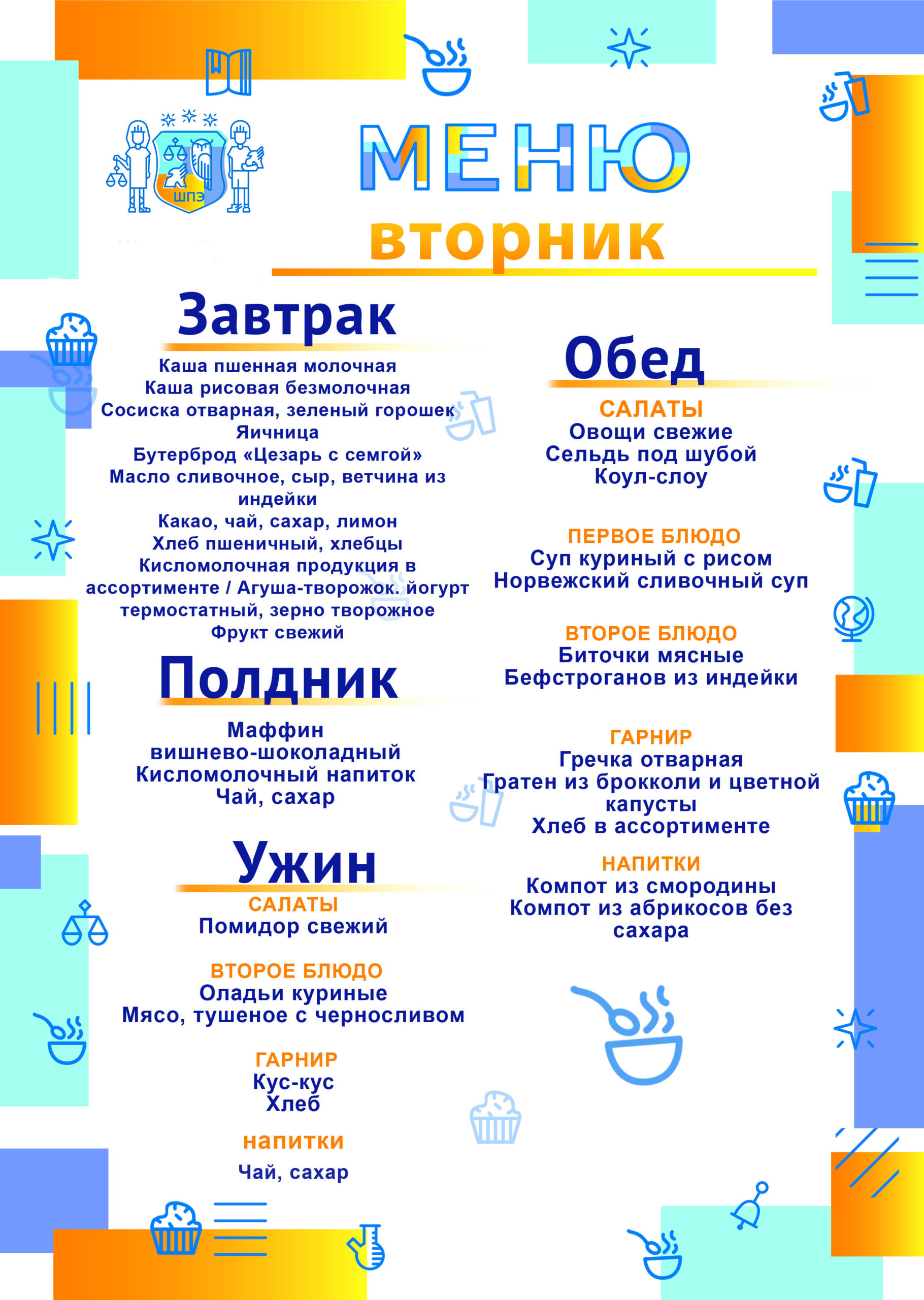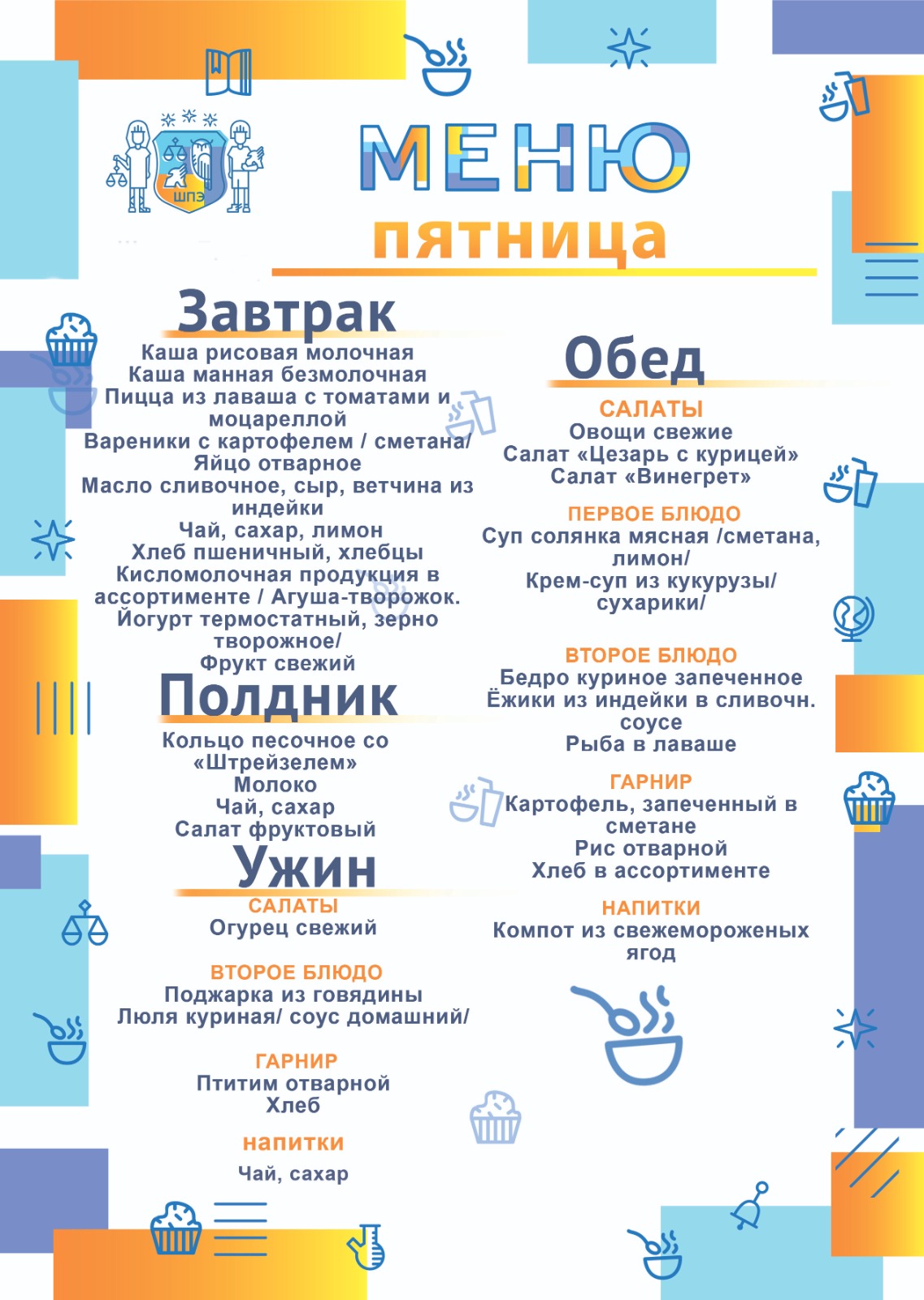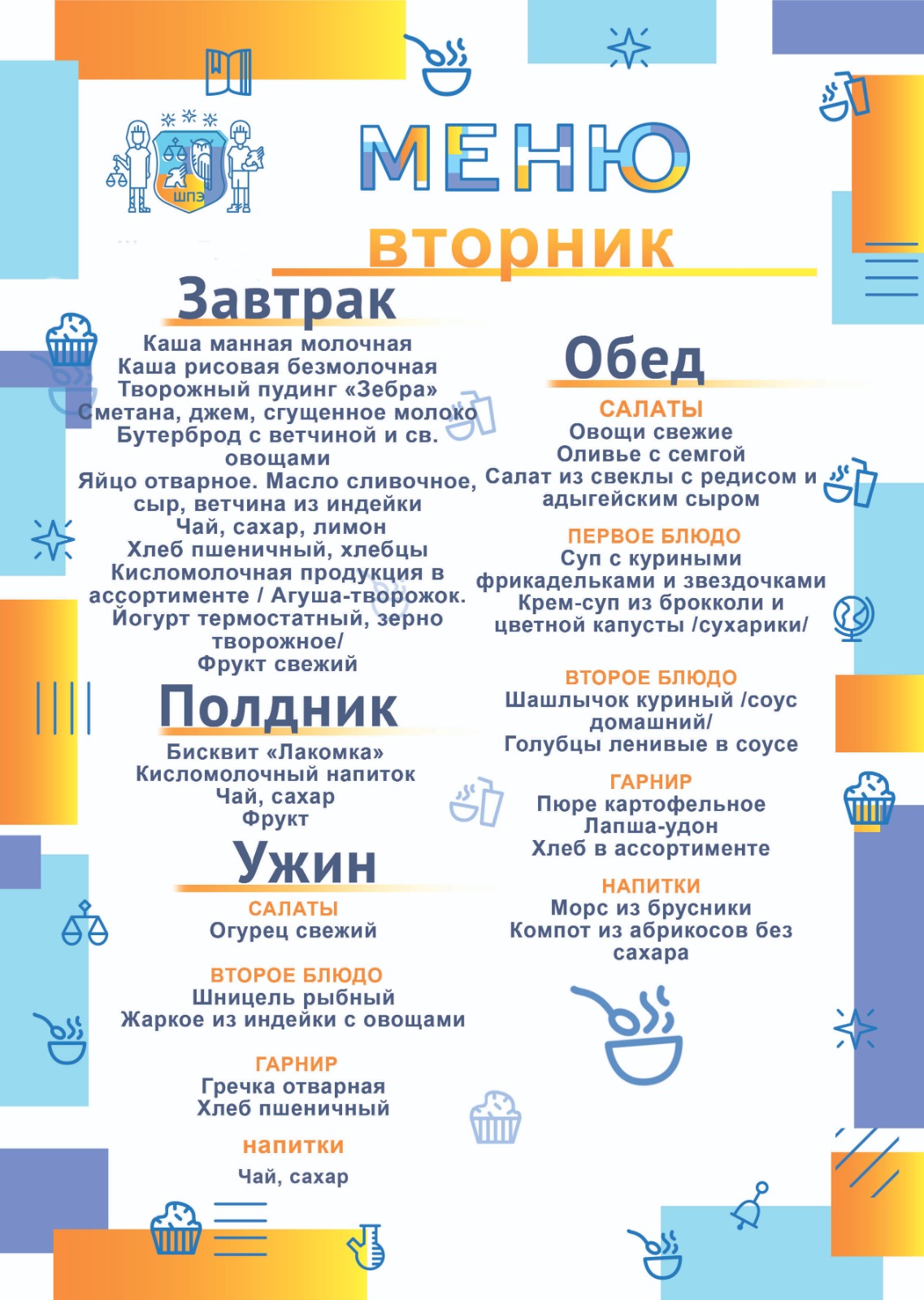 Обучающиеся школы получают полноценные, по-домашнему вкусные завтраки, обеды полдники и ужины, приготовленные в школьной столовой. Меню школьной столовой разработано с учетом индивидуальных особенностей учеников школы и отвечает запросам самых требовательных ценителей изысканной пищи. Поставка продуктов осуществляется российскими производителями сельскохозяйственной продукции, не содержащих ГМО.